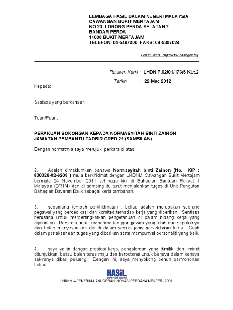 18 Contoh Surat Sokongan Perniagaan. 2 2 salinan kenyataan perkhidmatan 2 3 salinan laporan nilaian prestasi tahunan 2008 2 4 salinan penyata cuti terkini 2 5 surat sokongan pengesahan jabatan 2 6 salinan sijil sijil berkaitan.